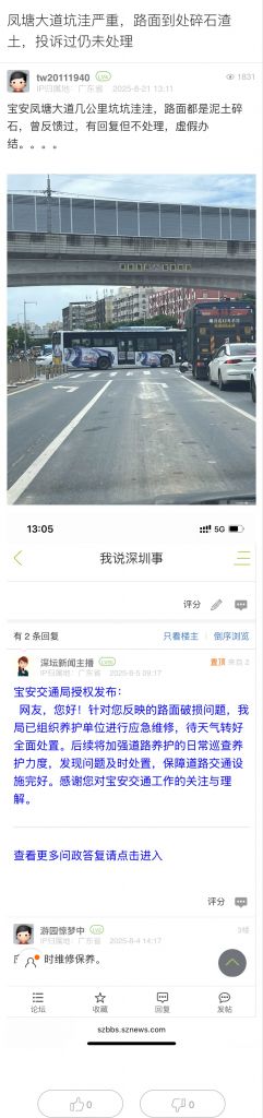 20. 帖文《鳳塘大道坑洼嚴重,路面到處碎石渣土,投訴過仍未處理》