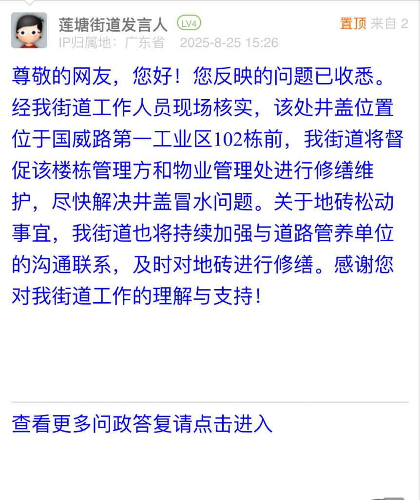 尊敬的網友,您好!您反映的問題已收悉。經我街道工作人員現場核實,該處井蓋位置位于國威路第一工業區102棟前,我街道將督促該樓棟管理方和物業管理處進行修繕維護,盡快解決井蓋冒水問題。關于地磚松動事宜,我街道也將持續加強與道路管養單位的溝通聯系,及時對地磚進行修繕。感謝您對我街道工作的理解與支持!