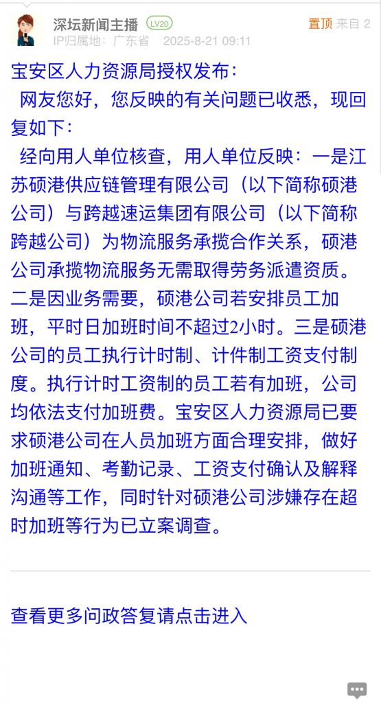 經向用人單位核查,用人單位反映:一是江蘇碩港供應鏈管理有限公司(以下簡稱碩港公司)與跨越速運集團有限公司(以下簡稱跨越公司)為物流服務承攬合作關系,碩港公司承攬物流服務無需取得勞務派遣資質。二是因業務需要,碩港公司若安排員工加班,平時日加班時間不超過2小時。三是碩港公司的員工執行計時制、計件制工資支付制度。執行計時工資制的員工若有加班,公司均依法支付加班費。寶安區人力資源局已要求碩港公司在人員加班方面合理安排,做好加班通知、考勤記錄、工資支付確認及解釋溝通等工作,同時針對碩港公司涉嫌存在超時加班等行為已立案調查。