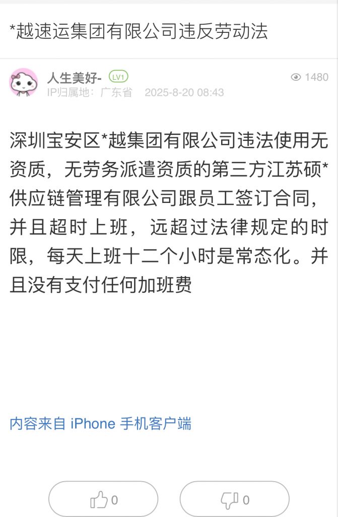 11. 帖文《*越速運集團有限公司違反勞動法》