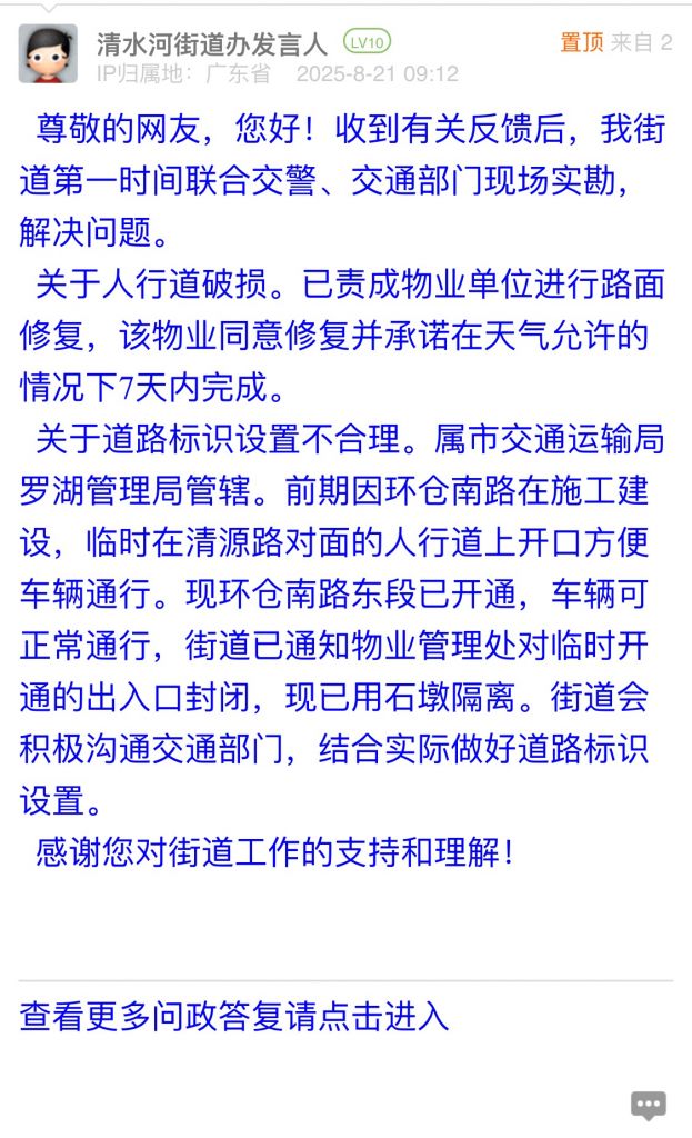 關于道路標識設置不合理。屬市交通運輸局羅湖管理局管轄。前期因環倉南路在施工建設,臨時在清源路對面的人行道上開口方便車輛通行。現環倉南路東段已開通,車輛可正常通行,街道已通知物業管理處對臨時開通的出入口封閉,現已用石墩隔離。街道會積極溝通交通部門,結合實際做好道路標識設置。