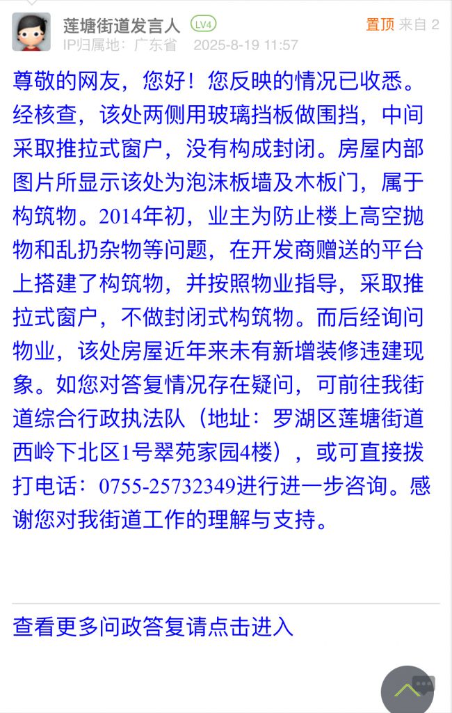 尊敬的網友,您好!您反映的情況已收悉。經核查,該處兩側用玻璃擋板做圍擋,中間采取推拉式窗戶,沒有構成封閉。房屋內部圖片所顯示該處為泡沫板墻及木板門,屬于構筑物。2014年初,業主為防止樓上高空拋物和亂扔雜物等問題,在開發商贈送的平臺上搭建了構筑物,并按照物業指導,采取推拉式窗戶,不做封閉式構筑物。而后經詢問物業,該處房屋近年來未有新增裝修違建現象。如您對答復情況存在疑問,可前往我街道綜合行政執法隊(地址:羅湖區蓮塘街道西嶺下北區1號翠苑家園4樓),或可直接撥打電話:0755-25732349進行進一步咨詢。感謝您對我街道工作的理解與支持。