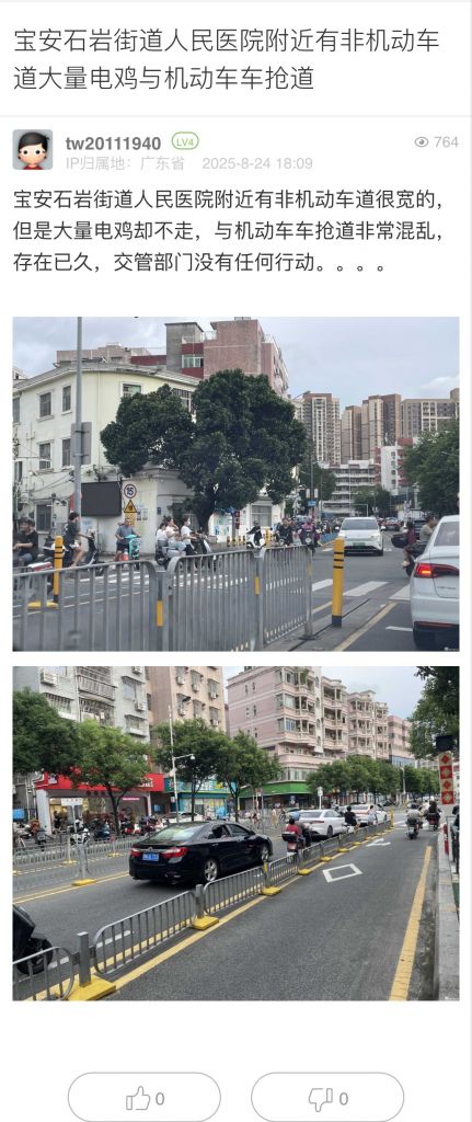 38. 帖文《寶安石巖街道人民醫院附近有非機動車道大量電雞與機動車車搶道》