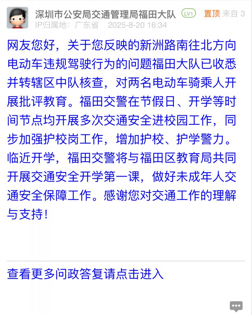 網友您好,關于您反映的新洲路南往北方向電動車違規駕駛行為的問題福田大隊已收悉并轉轄區中隊核查,對兩名電動車騎乘人開展批評教育。福田交警在節假日、開學等時間節點均開展多次交通安全進校園工作,同步加強護校崗工作,增加護校、護學警力。臨近開學,福田交警將與福田區教育局共同開展交通安全開學第一課,做好未成年人交通安全保障工作。感謝您對交通工作的理解與支持!