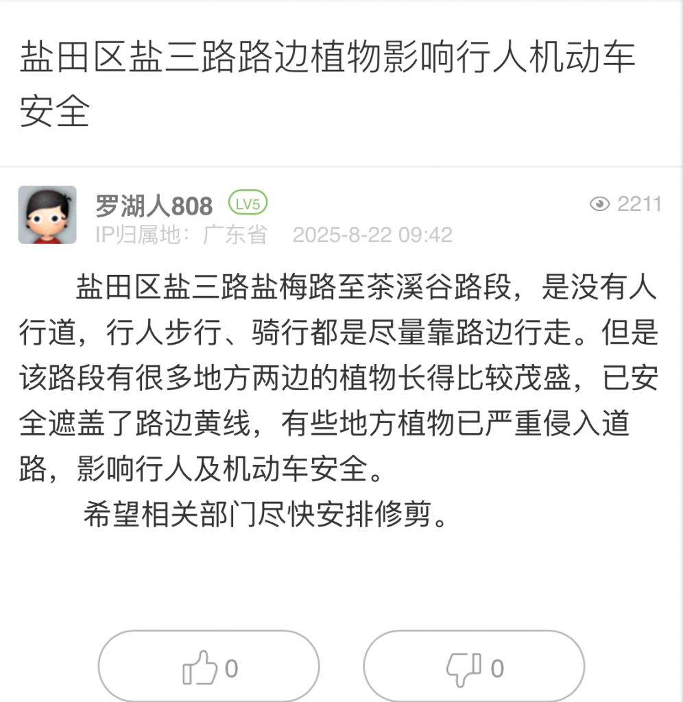 13. 帖文《深汕路龍東段毫無綠化,什么時候能夠改造提升》