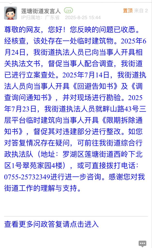 尊敬的網友,您好!您反映的問題已收悉。經核查,該處存在一處臨時建筑物。2025年6月24日,我街道執法人員已向當事人開具相關執法文書,督促當事人配合調查,我街道已進行立案查處。2025年7月14日,我街道執法人員向當事人開具《回避告知書》及《調查詢問通知書》,并對現場進行勘驗。2025年7月23日,我街道執法人員就畔山路43號三層平臺臨時建筑向當事人開具《限期拆除通知書》,督促其對違建部分進行整改。如您對答復情況存在疑問,可前往我街道綜合行政執法隊(地址:羅湖區蓮塘街道西嶺下北區1號翠苑家園4樓),或可直接撥打電話:0755-25732349進行進一步咨詢。感謝您對我街道工作的理解與支持。