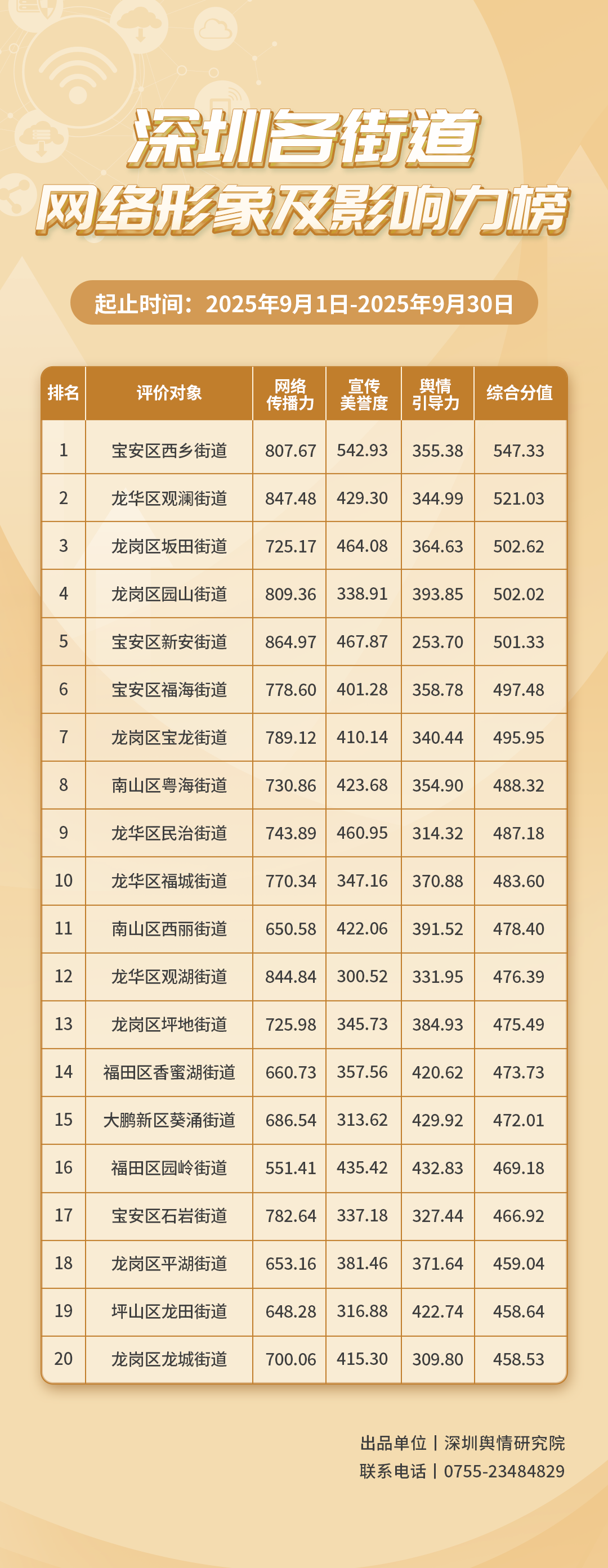 9月,各街道主動深入研究社交平臺的傳播特性,在此基礎(chǔ)上進一步完善并拓寬基層治理的路徑與模式。《深圳各街道網(wǎng)絡(luò)形象及影響力榜》(9月榜單)已編制完成,對各街道在網(wǎng)絡(luò)空間的展現(xiàn)及其影響力進行了全面的觀察與評估。本次榜單的數(shù)據(jù)統(tǒng)計時間跨度為2025年9月1日至9月30日。