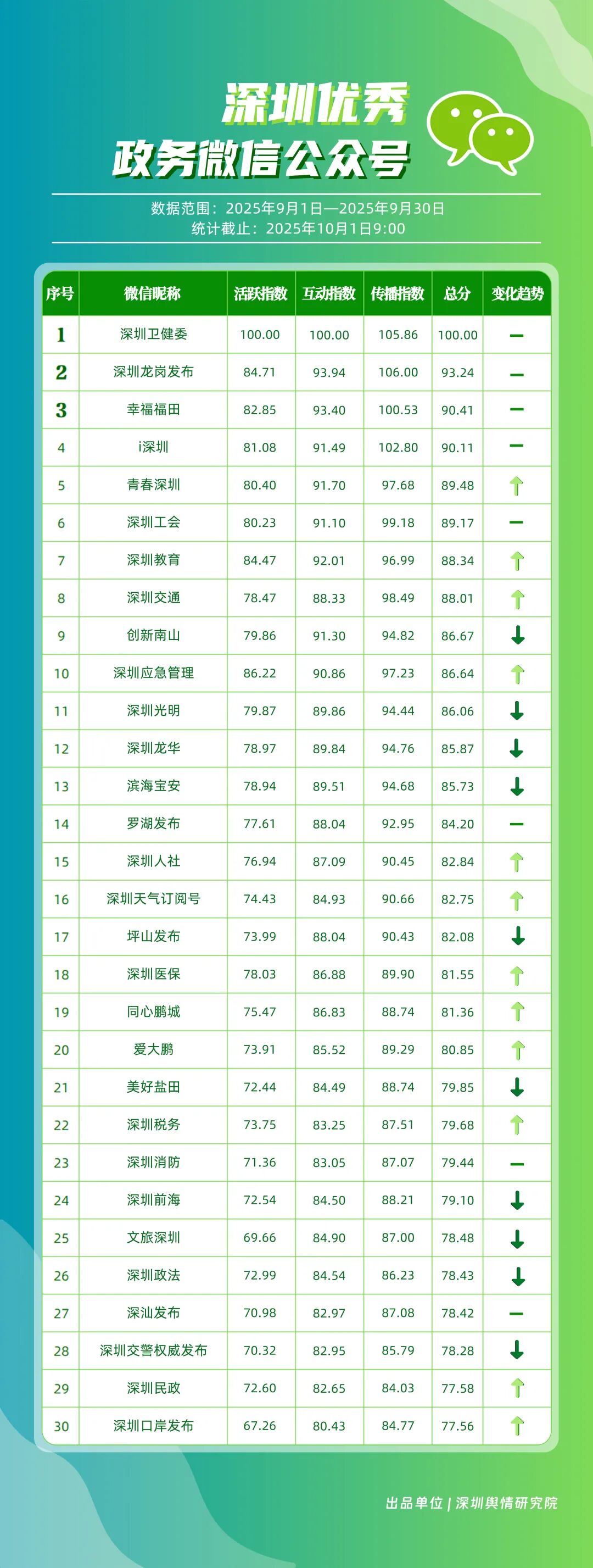9月,“深圳衛健委”“深圳龍崗發布”“幸福福田”“i深圳”“青春深圳”“深圳工會”“深圳教育”“深圳交通”“創新南山”“深圳應急管理”等30個政務微信公眾號榮登“深圳優秀政務微信公眾號”榜單。9月,“深圳衛健委”以總分100.00的成績蟬聯榜單首位,其憑借突破常規視角的選題,解讀專業健康知識,引發大量網民共鳴,內容質量與傳播力形成雙向賦能;“深圳龍崗發布”以總分93.24位居第二,聚焦區域民生服務升級等動態,信息觸達率不斷提升;“幸福福田”圍繞商圈經濟復蘇、文化節慶活動等主題開展系列宣傳,增強區域活力展示,位列第三;“i深圳”“青春深圳”“深圳工會”等也持續優化賬號內容,通過實用信息推送強化政務服務定位。