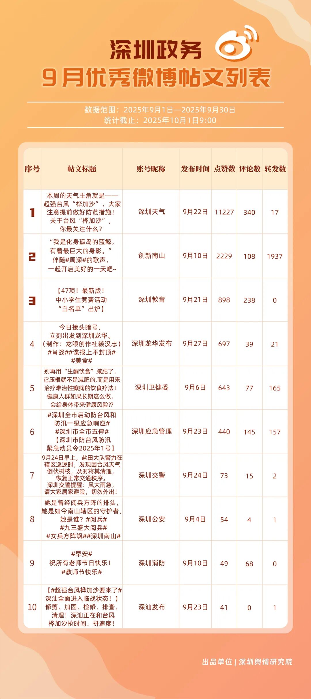 9月,20個賬號入選“優秀政務微博號”榜單,其中包括:“深圳天氣”“創新南山”“深圳龍崗發布”“深圳衛健委”“深圳消防”“深圳應急管理”“福田發布”“深圳公安”“深圳交警”“深圳教育”等。其中,“深圳天氣”蟬聯榜首,尤其9月出現臺風天氣,賬號受關注度再提升;“創新南山”賬號以多維度內容策略實現傳播效能提升,其內容中與歌手周深的聯動也成為一大亮點,獲得了較好傳播效果,以94.34分排名榜單第二;“深圳龍崗發布”“深圳衛健委”兩賬號得分均在93分以上,在區域宣傳、內容科普方向發力。上榜優秀微博賬號展現出較高的內容創新能力,以年輕化語態構建傳播體系,形成兼具專業性與傳播力的優秀案例。