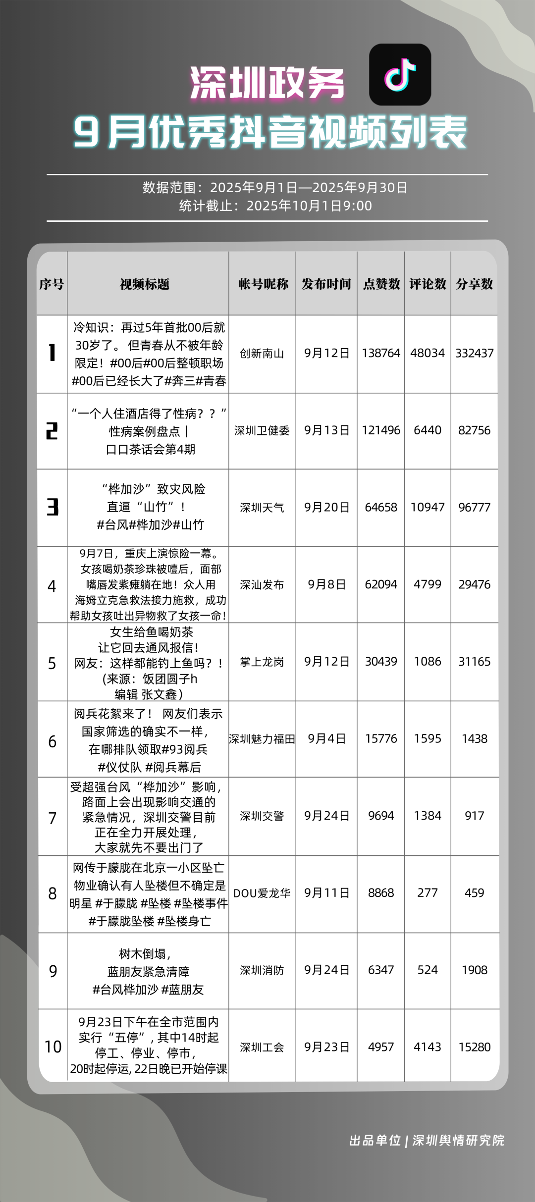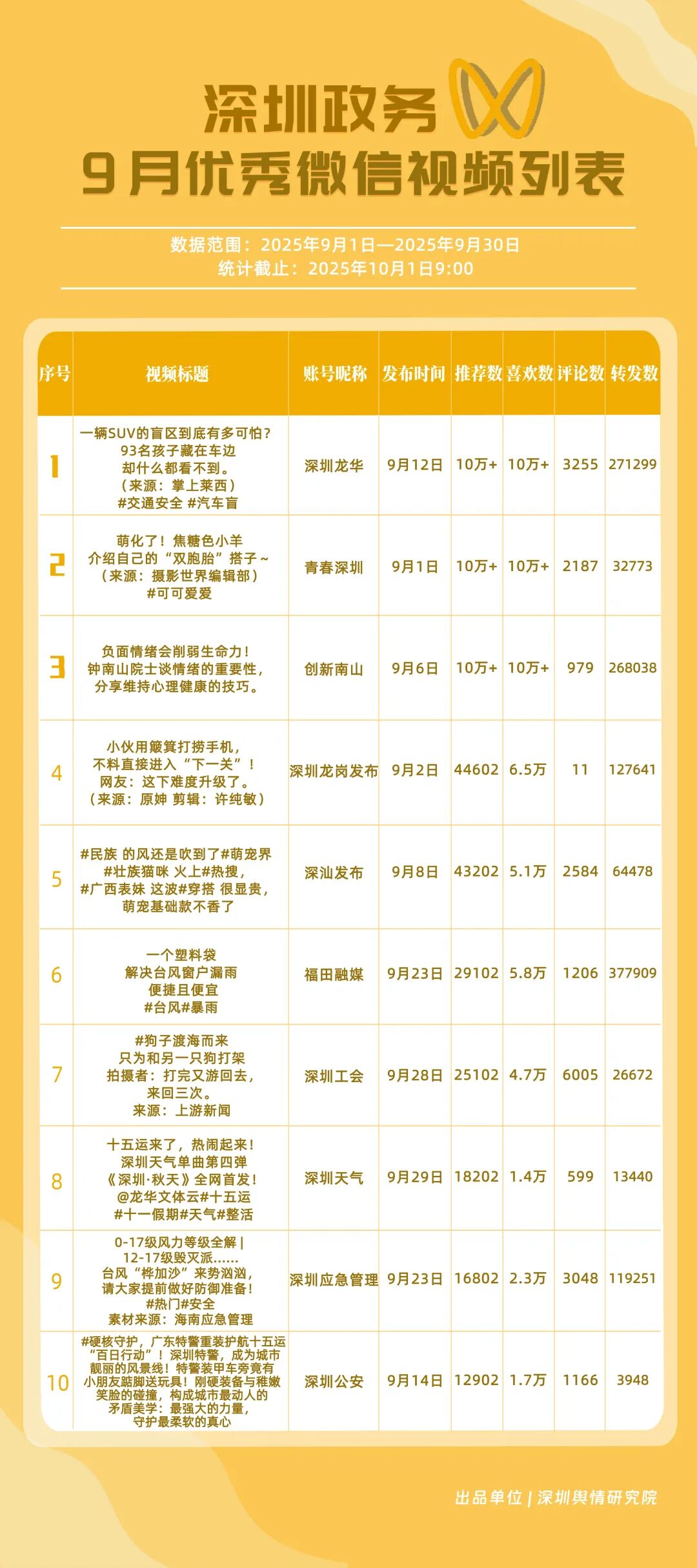 9月,獲得“優秀政務抖音號”稱號的是“創新南山”“深圳天氣”“深圳衛健委”“深圳魅力福田”“深汕發布”“掌上龍崗”“DOU愛龍華”“深圳工會”“青春深圳”“深圳交警”。“創新南山”以一條有關“青春不被年齡限定”的視頻獲得超34萬次轉發,超14萬次點贊,助力其在抖音榜單居于榜首;“深圳天氣”多條臺風相關視頻吸引大量網民關注、互動,在抖音平臺得分超98分;“深圳衛健委”“深圳魅力福田”“深汕發布”等賬號緊隨其后,得分均在92分以上。上榜的優秀政務抖音號以“有溫度”的敘事表達,將宣傳、服務內容轉化為網民喜聞樂見的視頻,收獲高點贊、高轉發的流量實績,更在評論區形成了良性互動生態,深度運營收獲了較好成果。
