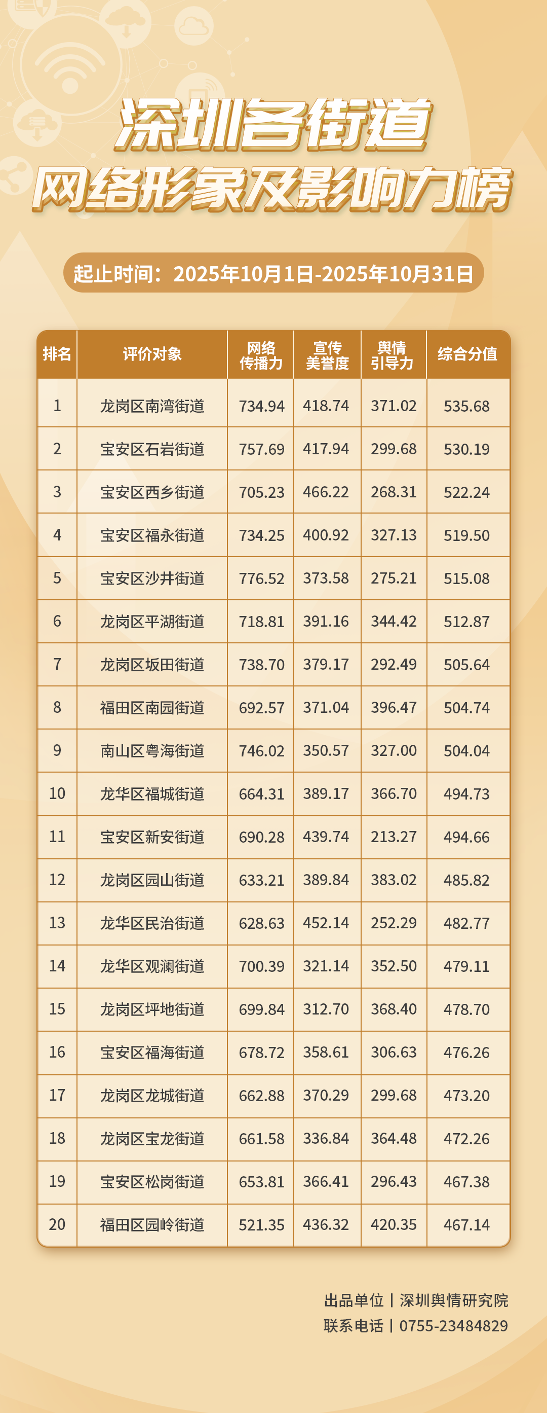 10月,各街道主動深耕社交平臺的傳播規(guī)律,優(yōu)化拓展基層治理。《深圳各街道網(wǎng)絡(luò)形象及影響力榜》(10月榜單)已編制完成,對各街道在網(wǎng)絡(luò)空間的展現(xiàn)及其影響力進(jìn)行了全面的觀察與評估。本次榜單的數(shù)據(jù)統(tǒng)計(jì)時(shí)間跨度為2025年10月1日至10月31日。